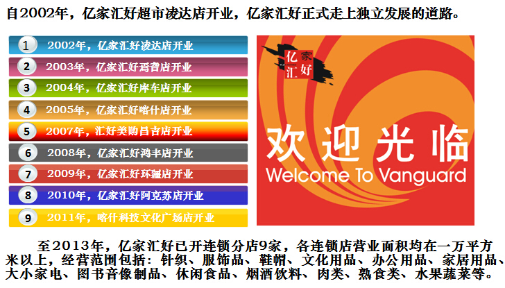 億家匯好商貿(mào)有限責(zé)任公司于2002年成立,并從臺(tái)灣引進(jìn)連鎖經(jīng)營(yíng)職業(yè)管理團(tuán)隊(duì),統(tǒng)一管理旗下各地的連鎖超市。公司通過(guò)多年的穩(wěn)健發(fā)展,至2013年底,億家匯好商貿(mào)有限責(zé)任公司已成為擁有員工近3000多人,下轄一個(gè)配送中心和9家連鎖超市的大型綜合性零售企業(yè)??偨?jīng)營(yíng)面積11萬(wàn)多平方米,配送中心輻射公司所有超市,年配送額可達(dá)2億元。公司大量吸納下崗職工,經(jīng)過(guò)崗前培訓(xùn),提高勞動(dòng)技能,實(shí)現(xiàn)了他們的再就業(yè),為維護(hù)社會(huì)和諧穩(wěn)定做出了貢獻(xiàn)。2013年,巴州億家匯好商貿(mào)有限責(zé)任公司在自治區(qū)零售業(yè)中穩(wěn)踞前三位,是自治區(qū)重要的流通龍頭企業(yè),2013年年銷售收入達(dá)10億人民幣。多年來(lái),公司一直重管理、抓實(shí)效、運(yùn)用先進(jìn)的管理手段和營(yíng)銷理念,秉承億家匯好人 時(shí)時(shí)尋求效率創(chuàng)新,事事講究專業(yè)技術(shù)的文化精髓,創(chuàng)造了良好的經(jīng)濟(jì)效益和社會(huì)效益。公司先后多次被消費(fèi)者協(xié)會(huì)評(píng)為誠(chéng)信單位,并多年被評(píng)為重合同,守信用單位。